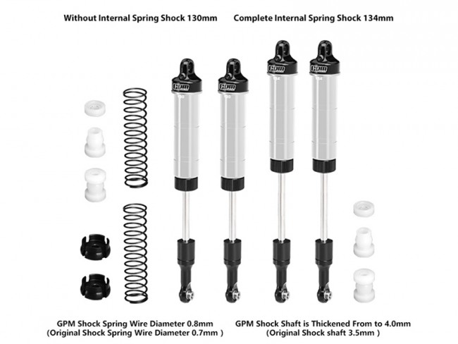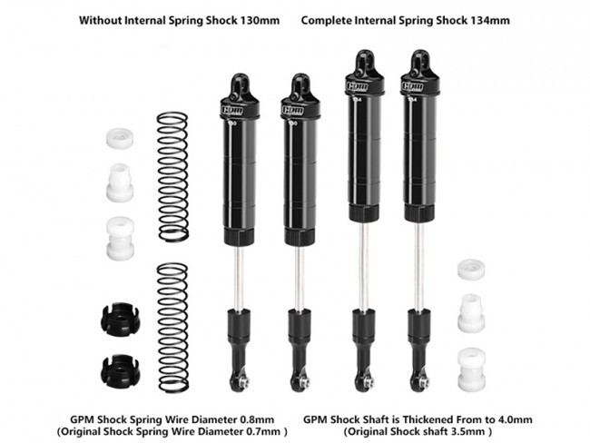 (6) Shock absorber kit includes: Two 130mm-center-distance shocks and two 134mm-center-distance shocks for flexible front/rear mounting.(You can use the 2 black internal springs with 0.8mm wire diameter and the 2 black spring retainers provided by GPM for self-installation.)