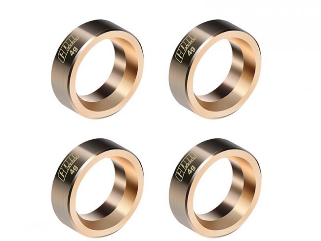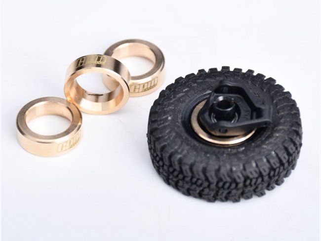 CNC machined solid brass billet - designed specifically for enhancing the climbing performance of the AXIAL SCX30. (4.0g each, outer diameter: 15.05mm , inner diameter: 10.5mm , width: 5mm) they are installed inside the wheels to lower the vehicle’s center of gravity, increase its stability, improve climbing ability, reduce the risk of flipping backwards, and make for an overall more capable crawler. They are secured to the inside of the Machete Wheels tire through friction. CA glue can be used for reinforcement during installation. This product is only compatible with original equipment wheels and steering blocks